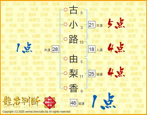 古(5画)小(3画)路(13画) 由(5画)梨(11画)香(9画)