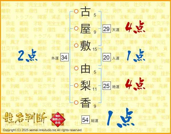 古(5画)屋(9画)敷(15画) 由(5画)梨(11画)香(9画)