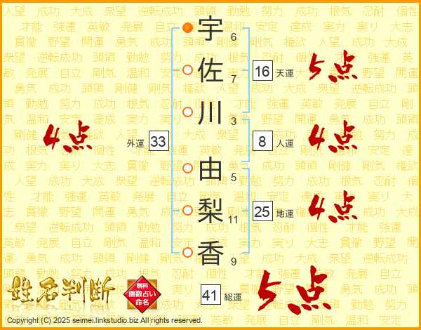 宇(6画)佐(7画)川(3画) 由(5画)梨(11画)香(9画)