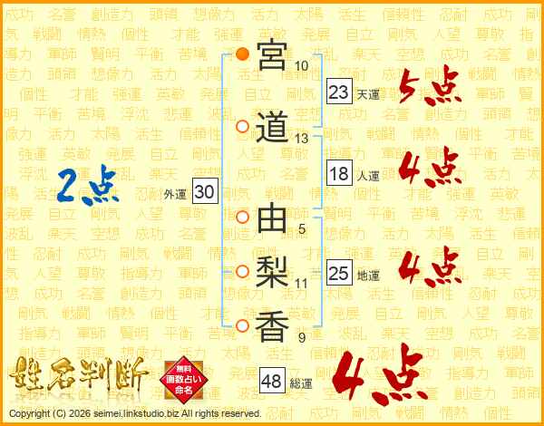 宮(10画)道(13画) 由(5画)梨(11画)香(9画)