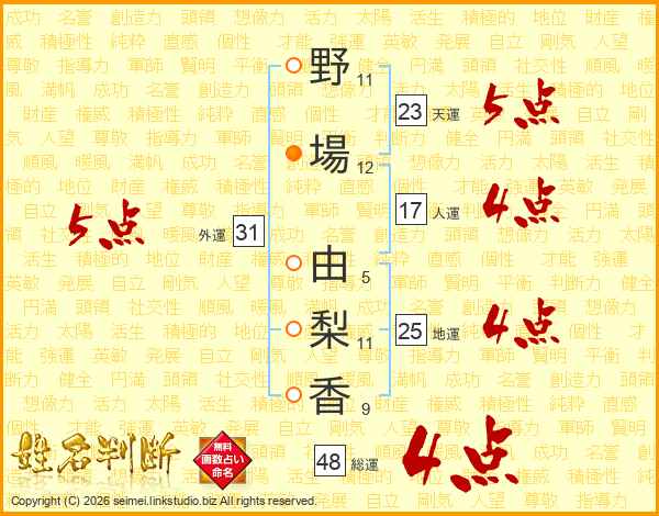 野(11画)場(12画) 由(5画)梨(11画)香(9画)