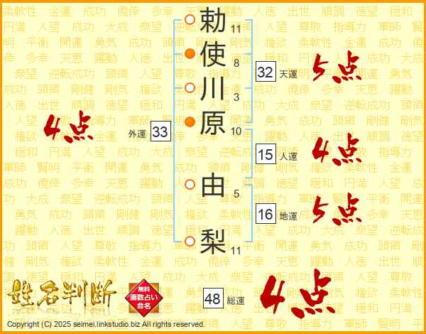 勅(11画)使(8画)川(3画)原(10画) 由(5画)梨(11画)