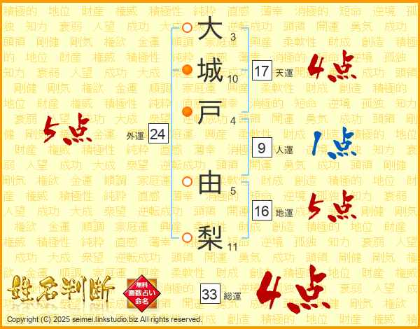 大(3画)城(10画)戸(4画) 由(5画)梨(11画)
