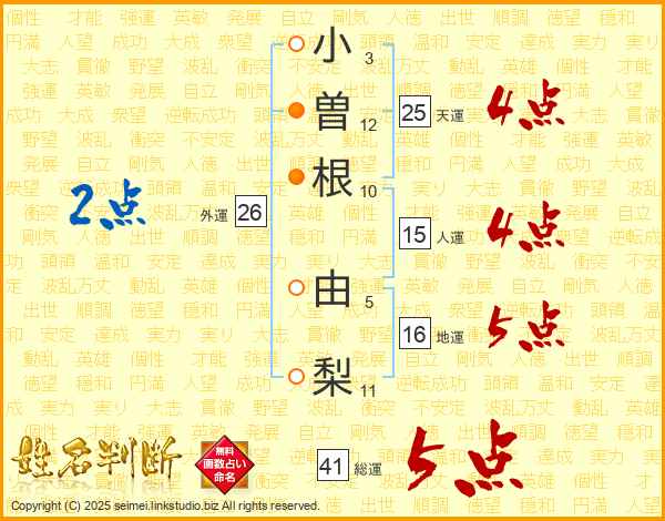 小(3画)曽(12画)根(10画) 由(5画)梨(11画)