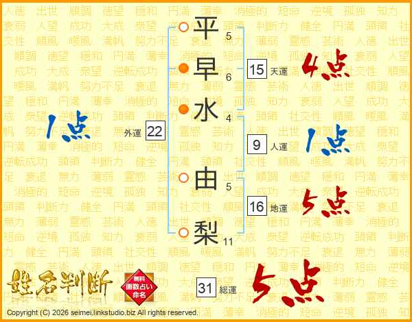 平(5画)早(6画)水(4画) 由(5画)梨(11画)