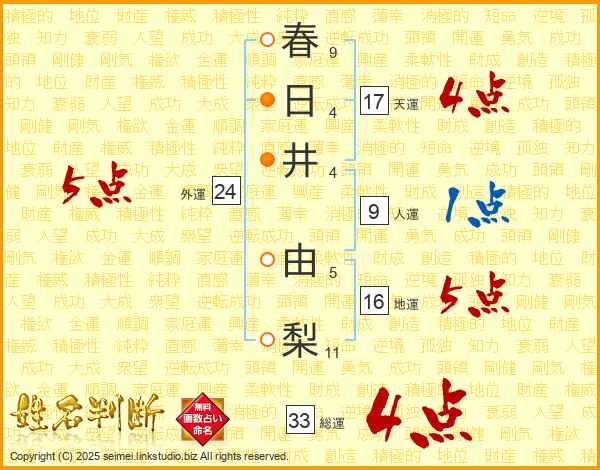 春日井由梨さんの総運は33画の4点!