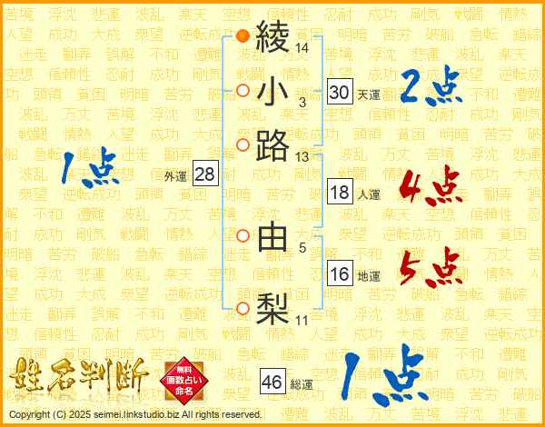 綾(14画)小(3画)路(13画) 由(5画)梨(11画)