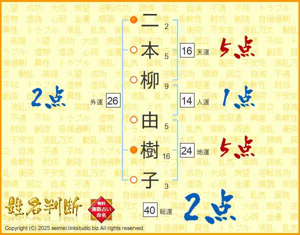 二(2画)本(5画)柳(9画) 由(5画)樹(16画)子(3画)