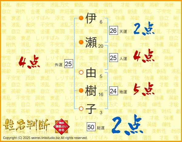 伊瀬由樹子さんの人運は25画の4点!