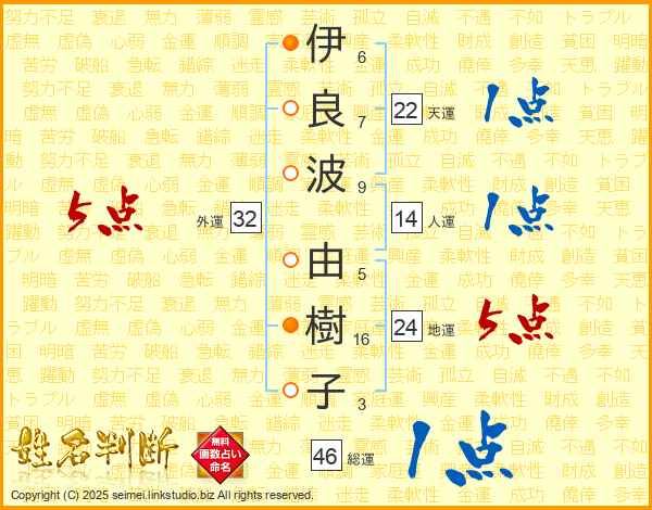 伊(6画)良(7画)波(9画) 由(5画)樹(16画)子(3画)