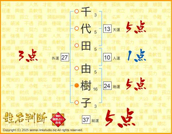 千代田由樹子さんの総運は37画の5点!