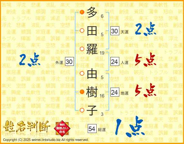 多(6画)田(5画)羅(19画) 由(5画)樹(16画)子(3画)