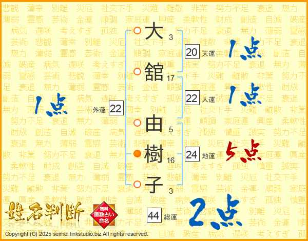 大(3画)舘(17画) 由(5画)樹(16画)子(3画)