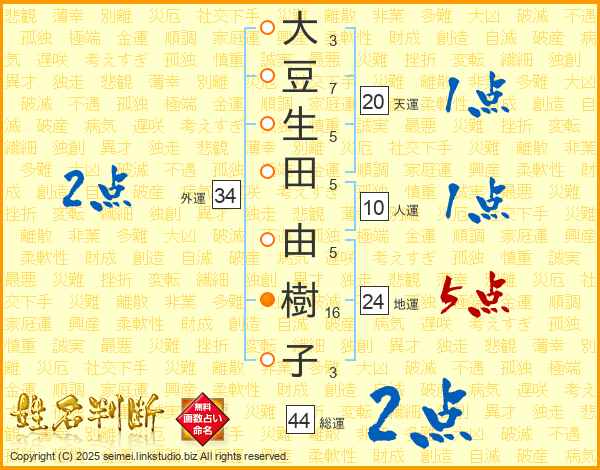 大(3画)豆(7画)生(5画)田(5画) 由(5画)樹(16画)子(3画)