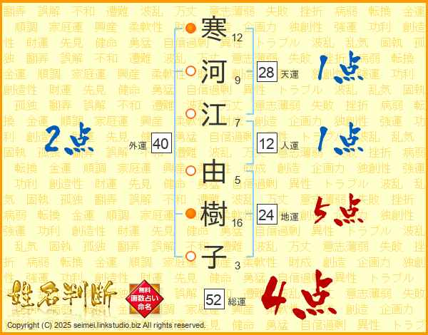 寒(12画)河(9画)江(7画) 由(5画)樹(16画)子(3画)