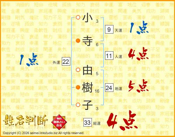 小(3画)寺(6画) 由(5画)樹(16画)子(3画)