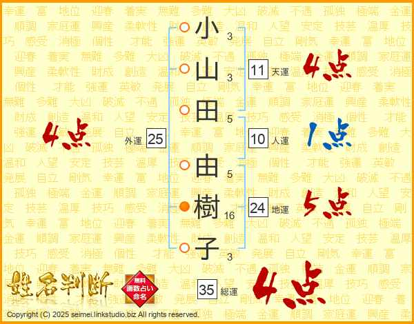 小(3画)山(3画)田(5画) 由(5画)樹(16画)子(3画)