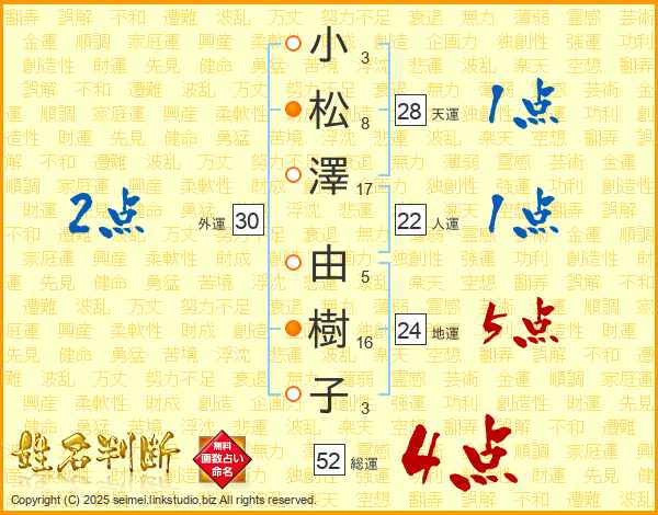 小(3画)松(8画)澤(17画) 由(5画)樹(16画)子(3画)