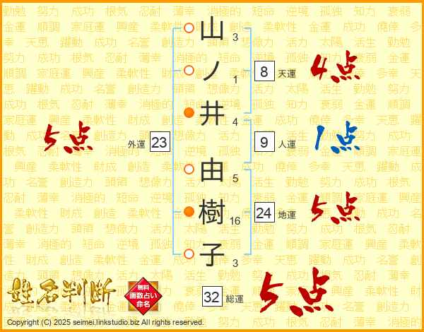 山(3画)ノ(1画)井(4画) 由(5画)樹(16画)子(3画)