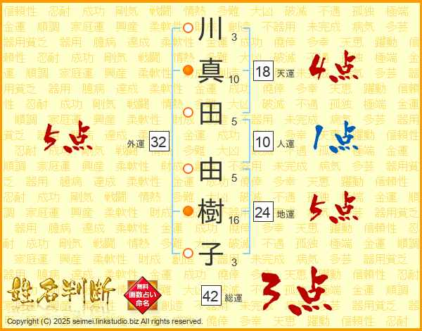 川(3画)真(10画)田(5画) 由(5画)樹(16画)子(3画)
