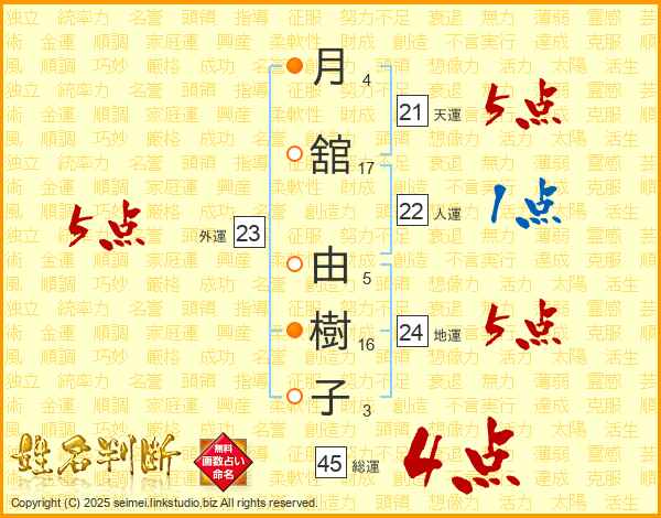 月(4画)舘(17画) 由(5画)樹(16画)子(3画)