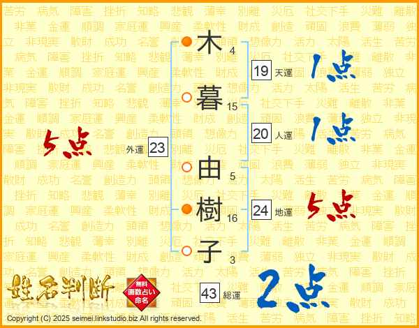 木(4画)暮(15画) 由(5画)樹(16画)子(3画)