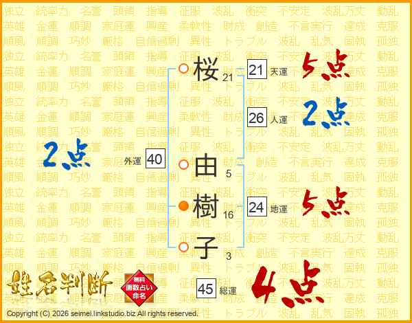 生活面を象徴する運勢です。外部から受ける影響力を表し、結婚運、家庭運や職場、環境への順応性を表します。総運から人運を引いた画数。姓や名が1文字の場合を除く。