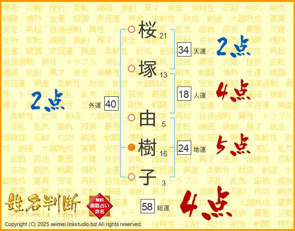 桜(21画)塚(13画) 由(5画)樹(16画)子(3画)