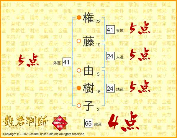 権(22画)藤(19画) 由(5画)樹(16画)子(3画)