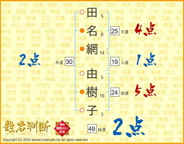 田(5画)名(6画)網(14画) 由(5画)樹(16画)子(3画)