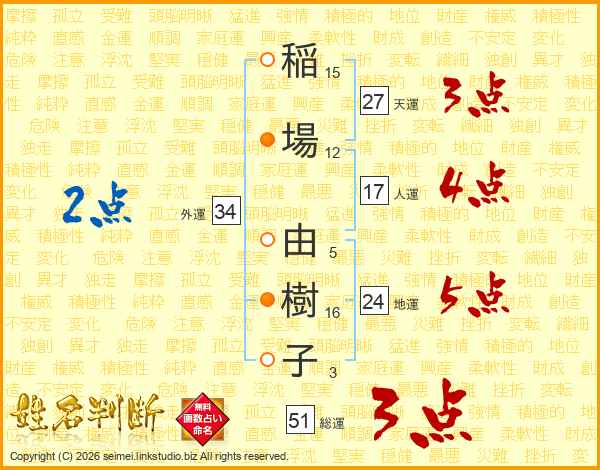 稲(15画)場(12画) 由(5画)樹(16画)子(3画)