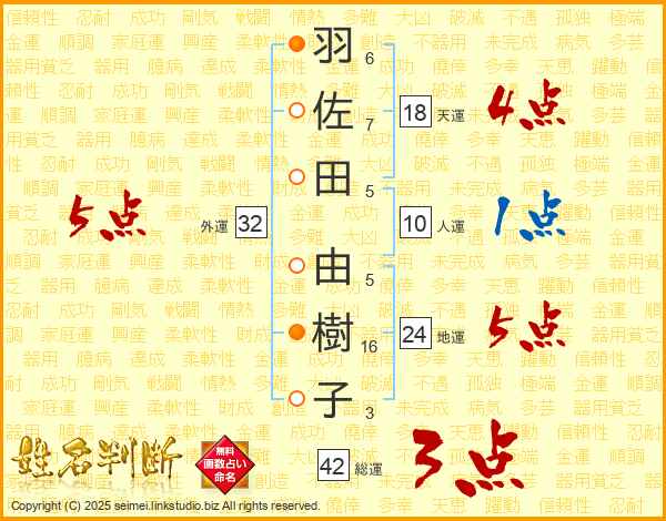 羽(6画)佐(7画)田(5画) 由(5画)樹(16画)子(3画)
