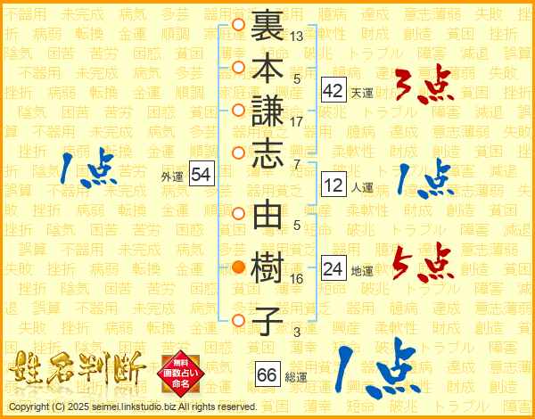 裏(13画)本(5画)謙(17画)志(7画) 由(5画)樹(16画)子(3画)
