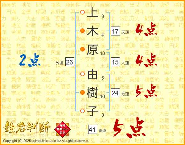 上(3画)木(4画)原(10画) 由(5画)樹(16画)子(3画)