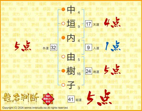 中垣内由樹子さんの総運は41画の5点!