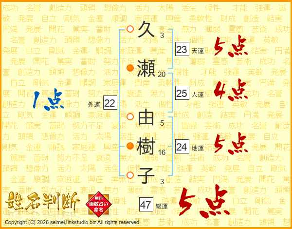 久瀬由樹子さんの総運は47画の5点!
