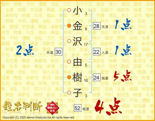 小(3画)金(8画)沢(17画) 由(5画)樹(16画)子(3画)
