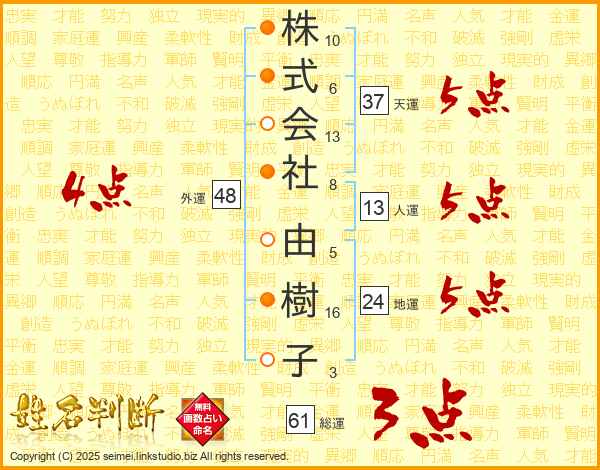 株式会社由樹子さんの総運は61画の3点!