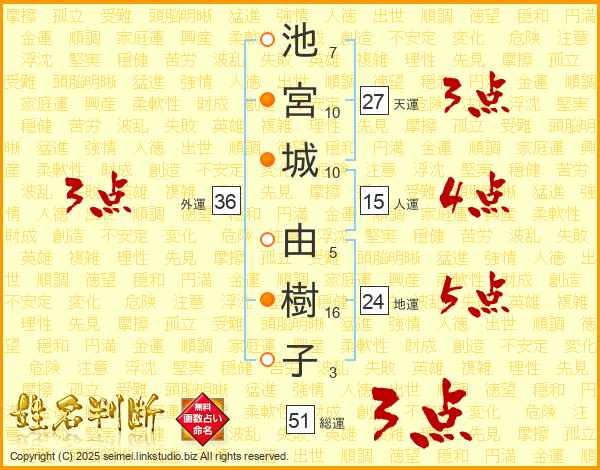 池(7画)宮(10画)城(10画) 由(5画)樹(16画)子(3画)