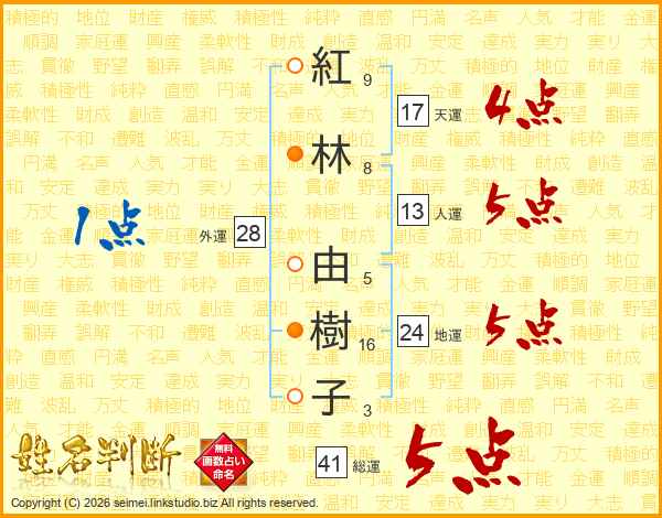 紅(9画)林(8画) 由(5画)樹(16画)子(3画)