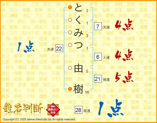 と(2画)く(1画)み(3画)つ(1画) 由(5画)樹(16画)