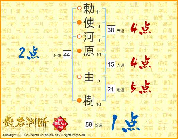 勅(11画)使(8画)河(9画)原(10画) 由(5画)樹(16画)