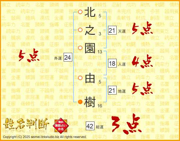 北(5画)之(3画)園(13画) 由(5画)樹(16画)