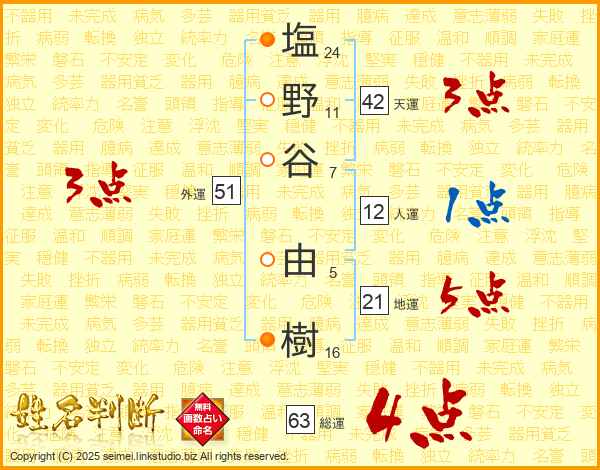 塩(24画)野(11画)谷(7画) 由(5画)樹(16画)