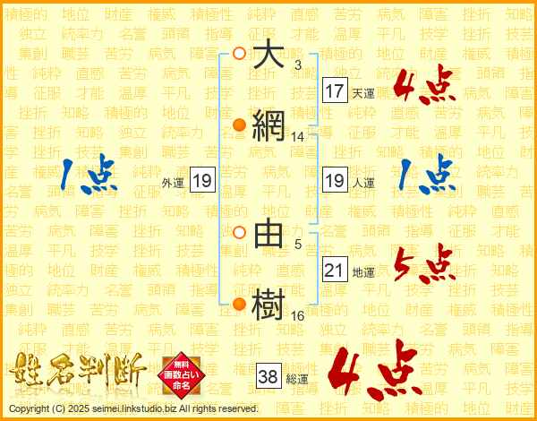 生活面を象徴する運勢です。外部から受ける影響力を表し、結婚運、家庭運や職場、環境への順応性を表します。総運から人運を引いた画数。姓や名が1文字の場合を除く。