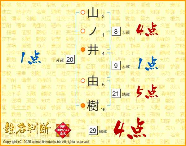 山(3画)ノ(1画)井(4画) 由(5画)樹(16画)