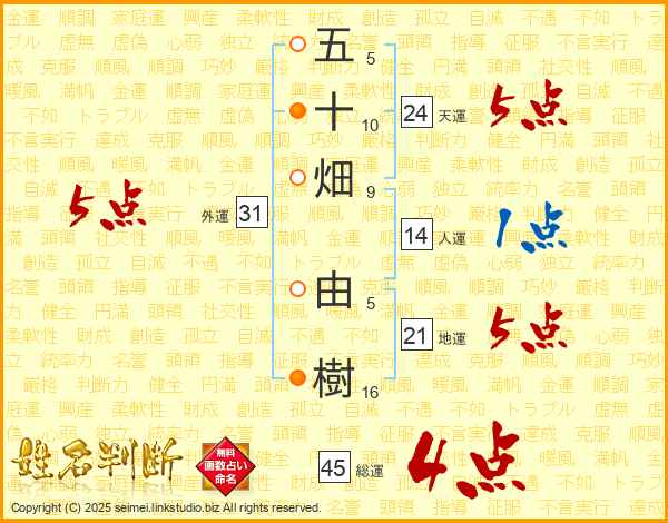 五(5画)十(10画)畑(9画) 由(5画)樹(16画)