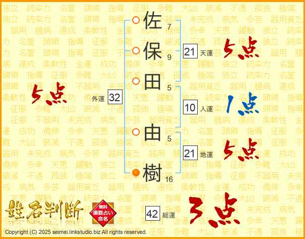佐(7画)保(9画)田(5画) 由(5画)樹(16画)