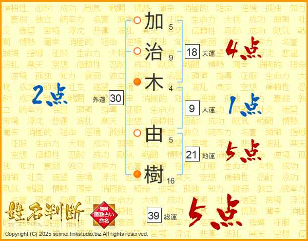 加(5画)治(9画)木(4画) 由(5画)樹(16画)