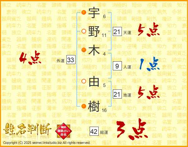 宇(6画)野(11画)木(4画) 由(5画)樹(16画)